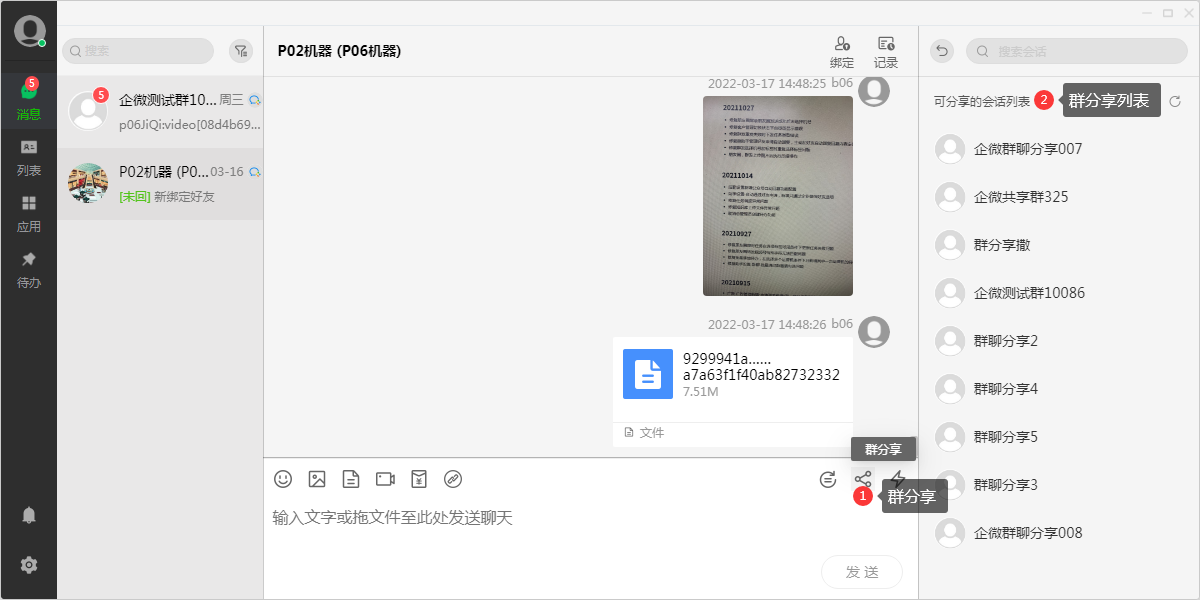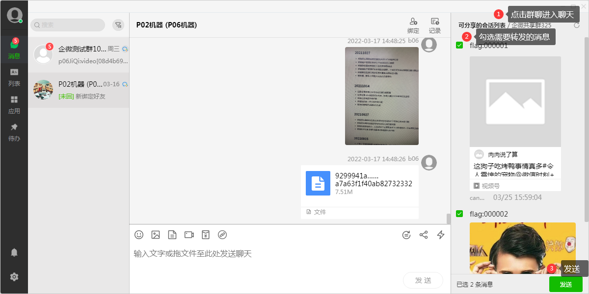 (2) 再发送需要转发的内容到群里,包含图片、视频、文件、链接、小程序、视频号